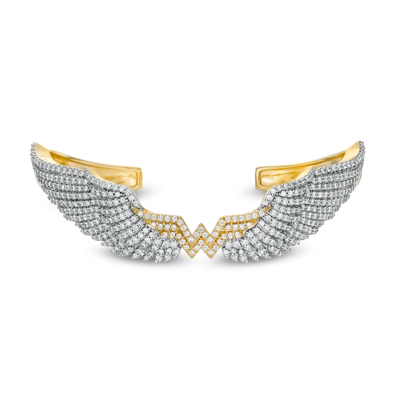 Soar to new heights in style with this show-stopping diamond wing bangle. Crafted in warm 10K gold, this dazzling design features layered feathers decked with shimmering diamonds. At the center, the logo sparkles with diamond-studded detail. Spectacular with 3 cts. t.w. of diamonds and a brilliant buffed luster, this bracelet measures 7.25 inches in circumference and slips on and off for easy wear. Embodying strength and grace, This exclusive fine jewelry collection inspires you to wear your strength, confidence and power.